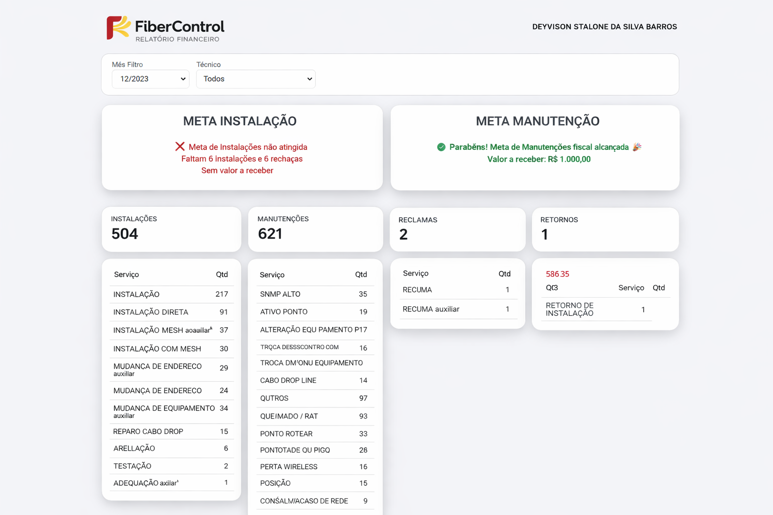 Sou o criador do FiberControl, um sistema em produção desenvolvido para centralizar informações operacionais e financeiras, automatizar rotinas e fornecer visibilidade real para tomada de decisão. Não se trata de um projeto conceitual, mas de uma solução utilizada no dia a dia, lidando com regras de negócio, dados sensíveis e operação contínua.